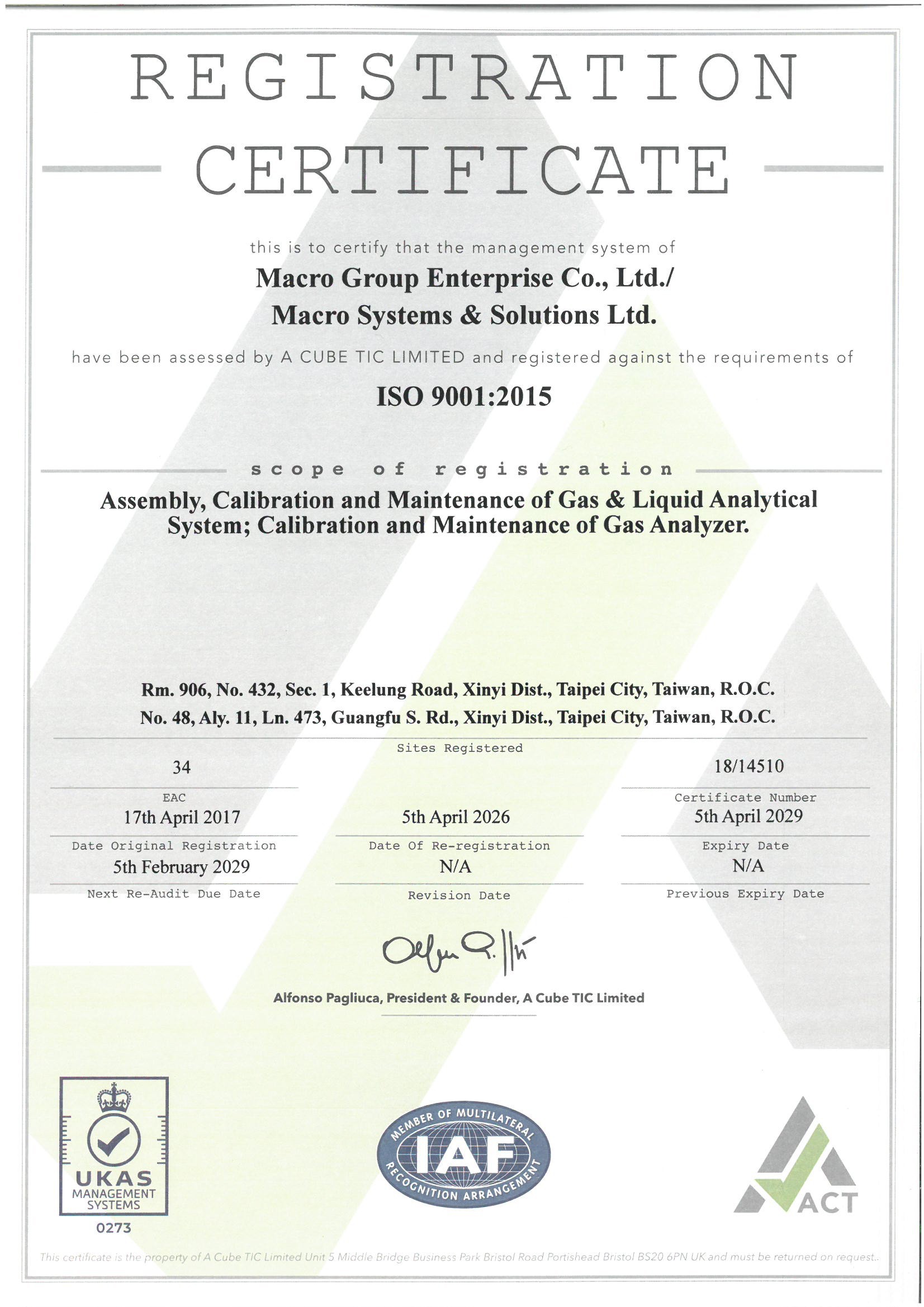 於2026年四月通過 國際ISO-9001:2015 認證之内部品質管控。(證書換發有效期至2029年2月)